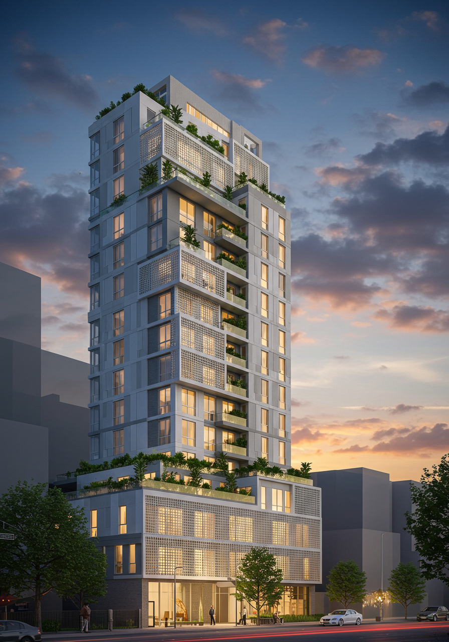 Just one street to the south of our last site is 100 Vandam Street, another notably tall residential building for the Hudson Square neighborhood. Designed by COOKFOX Architects and developed by Jeff Greene, the 25-story mixed-use tower reuses and incorporates a former power plant as the podium for the property. The architectural contrast between the thick load bearing brick walls and the main tower's glass walls and protruding concrete balconies directly above makes it a distinct element and visual sight from up close and from afar. There are 72 units marketed by Douglas Elliman Development Marketing that range from one- to four-bedroom layouts, 2500 square feet of commercial space in the lower levels, and amenities such as a 1,220-square-foot fitness center with yoga and training studios, a 1,600-square-foot screening room, a media room, residential lounge, children’s playroom, bicycle room, cold storage, in-house washers and dryers, a live-in super, package room, parking and storage available for purchase, and a double-height lobby with concierge service.