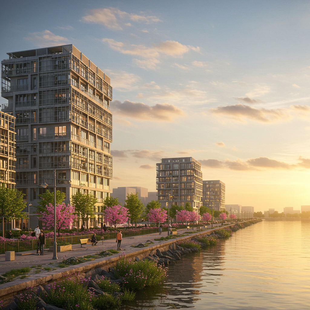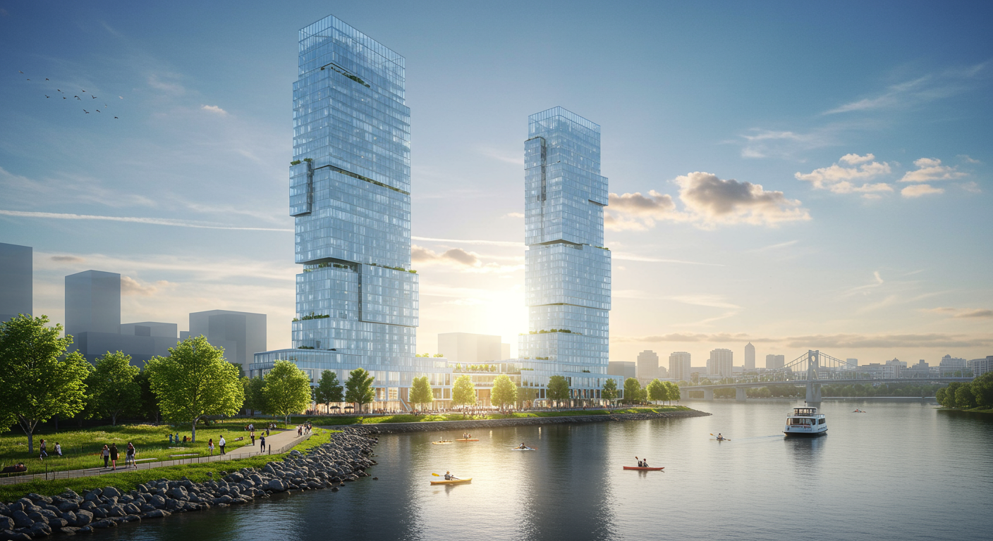 One of the most distinguished and newly iconic landmarks along the Greenpoint waterfront is Eagle + West, a pair of stepped and cantilevering 30- and 40-story residential towers. Addressed as 227 West Street, the rental property is designed by OMA and Beyer Blinder Belle and was developed by Brookfield Property Partners and Park Tower Group. The recently completed project yields 745 apartments in Greenpoint that range from studios to three-bedroom layouts of which 224 residences are designated as affordable housing. Marmol Radziner is the interior designer of Eagle + West, which is located at the corner of Eagle and West Streets. Directly in front along the East River is an esplanade designed by James Corner Field Operations.