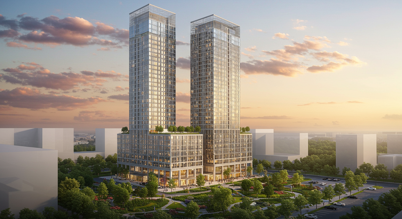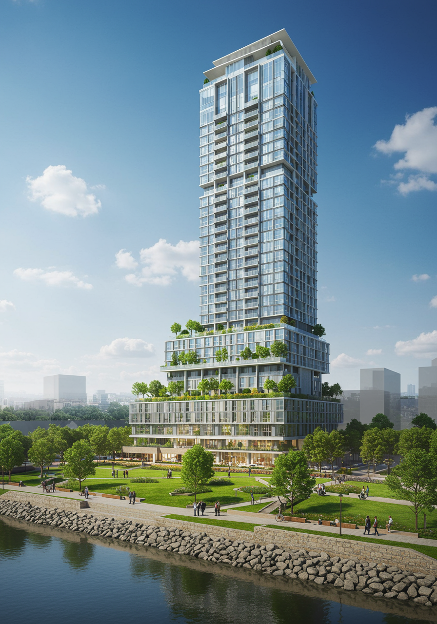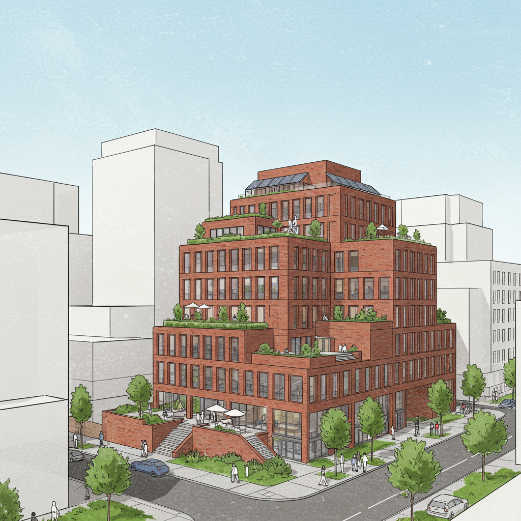 Future residential amenities at The Huron include a fitness center with locker rooms and saunas, an indoor saltwater swimming pool, a lounge, co-working spaces, a private dining room, a media room, a children’s playroom, an outdoor playground, a music practice room, a package room, an outdoor rooftop terrace equipped with BBQ grills, a bike room, and on-site parking. Select homes will come with private outdoor balconies and terraces that collectively total 20,000 square feet.