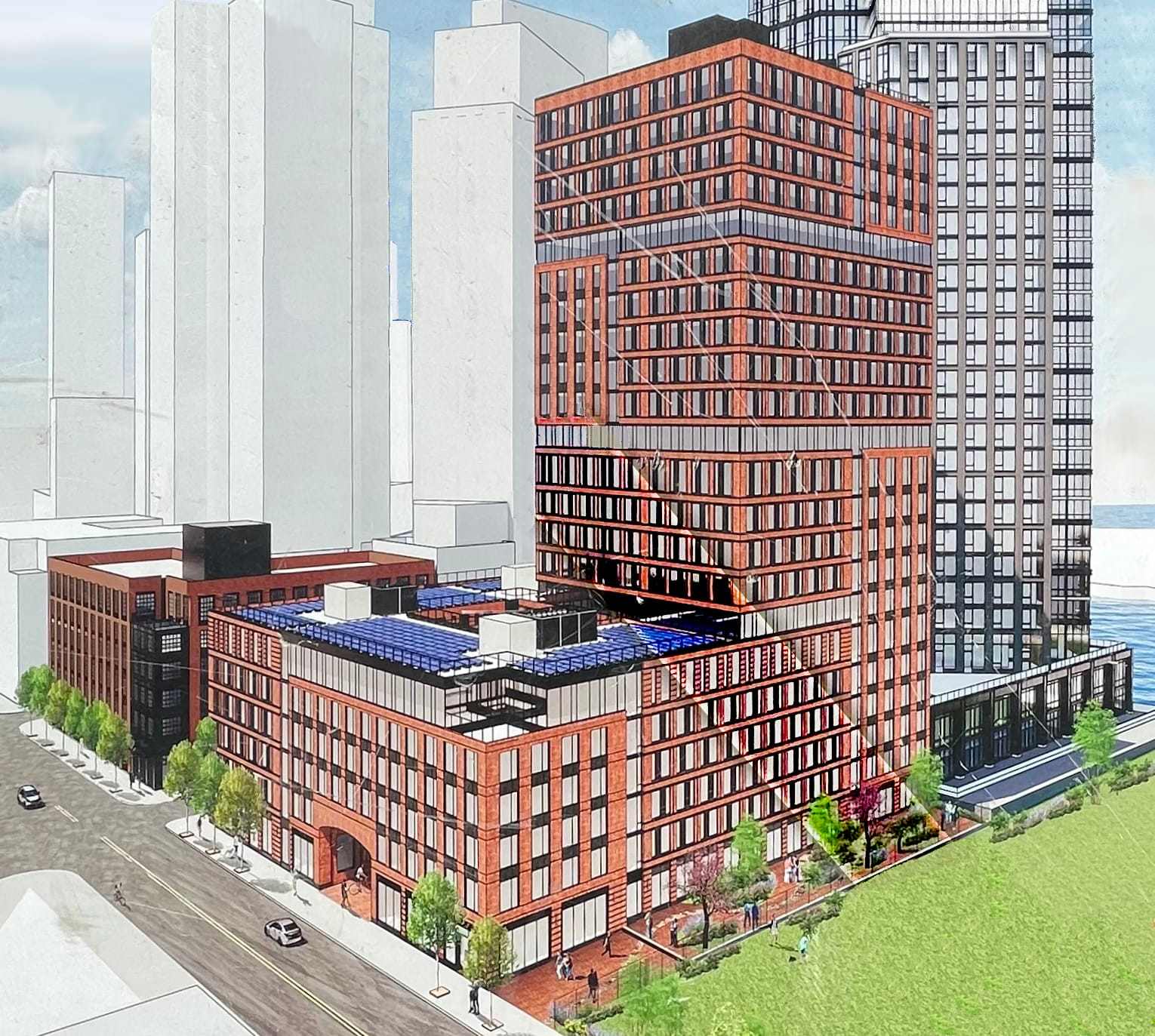 Another new development with a modestly large number of apartments in Brooklyn along the East River is The Huron, a structurally topped out pair of 13-story buildings currently under construction at 29 Huron Street. Designed by Morris Adjmi Architects and developed by Quadrum Global, the ground-up structures rise from a multi-story podium and will yield a total of 171 condominium units ranging from studios to four-bedroom layouts, which are complemented by 30,000 square feet of amenities. Ryan Serhant of SERHANT is leading sales and marketing for the property, which is bound by Green Street to the north, Huron Street to the south, West Street to the east, and the East River to the west.