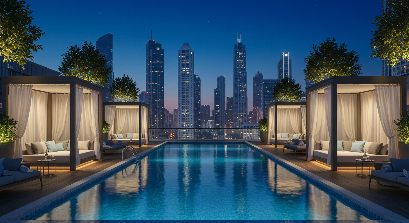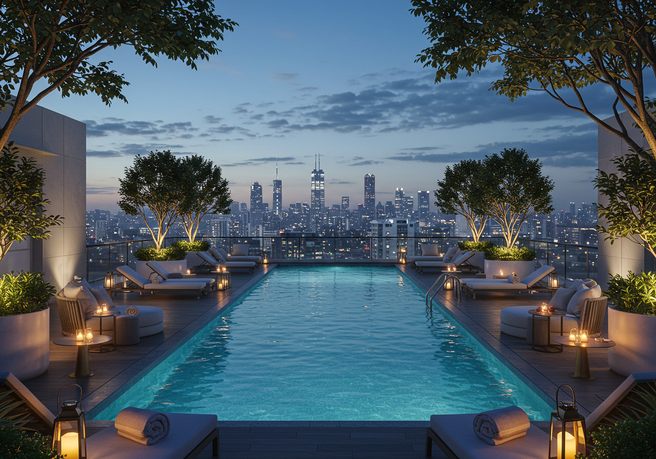 Located at 243 West 28th Street, this two-tower mixed-use residential complex is one of the newest buildings to have gone up in Manhattan's Chelsea neighborhood and is topped with an outdoor swimming pool with prime views over the district, and sits next to an adjacent lounge.