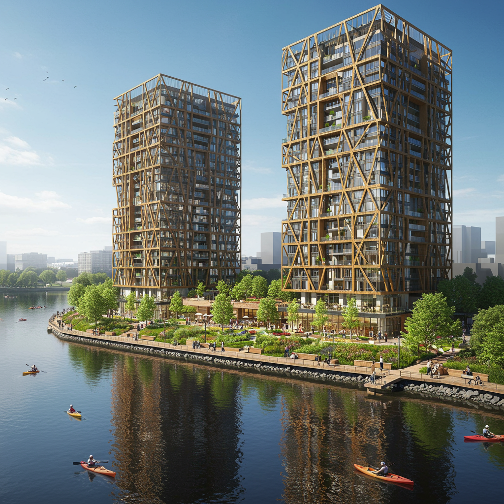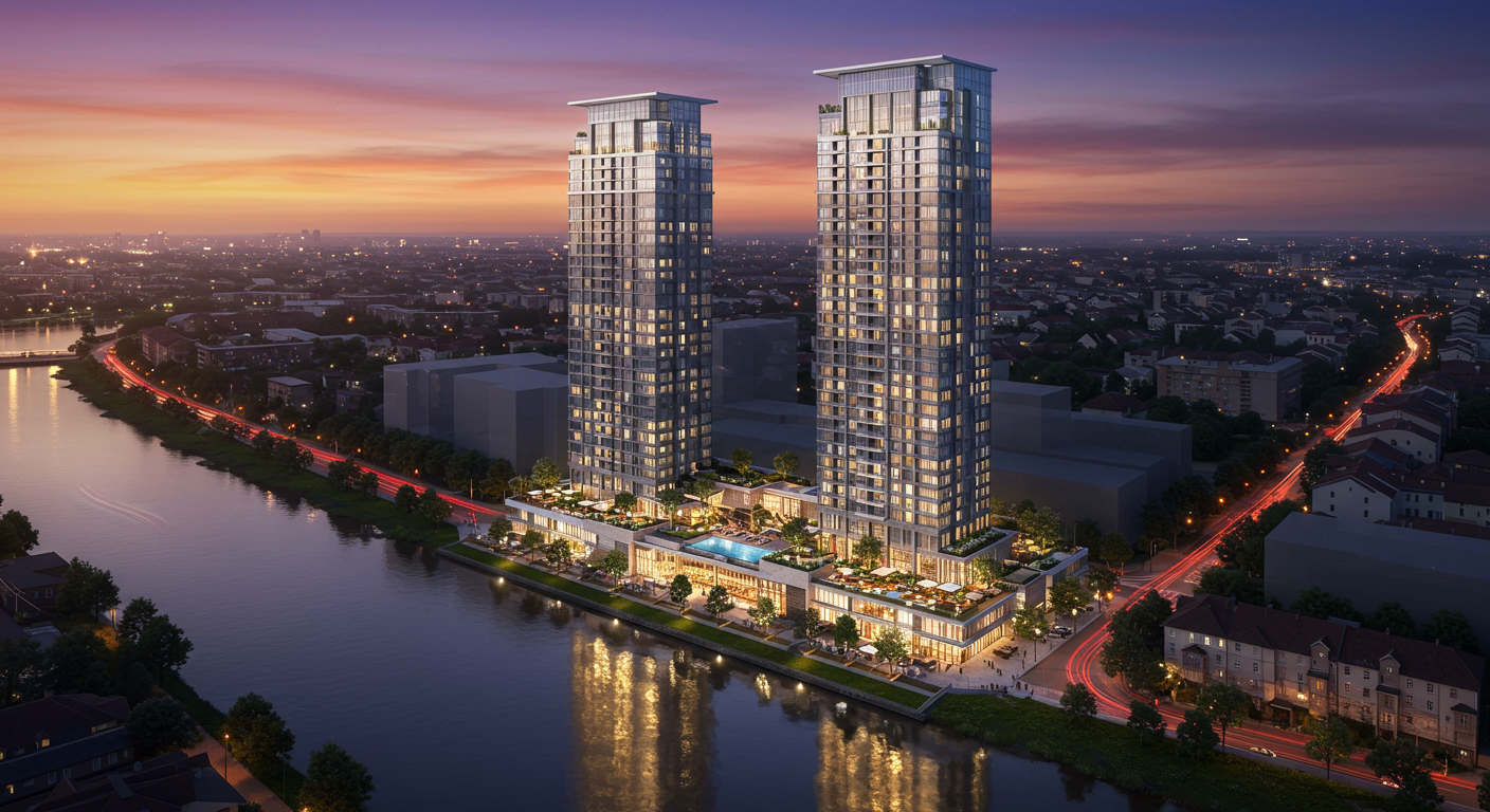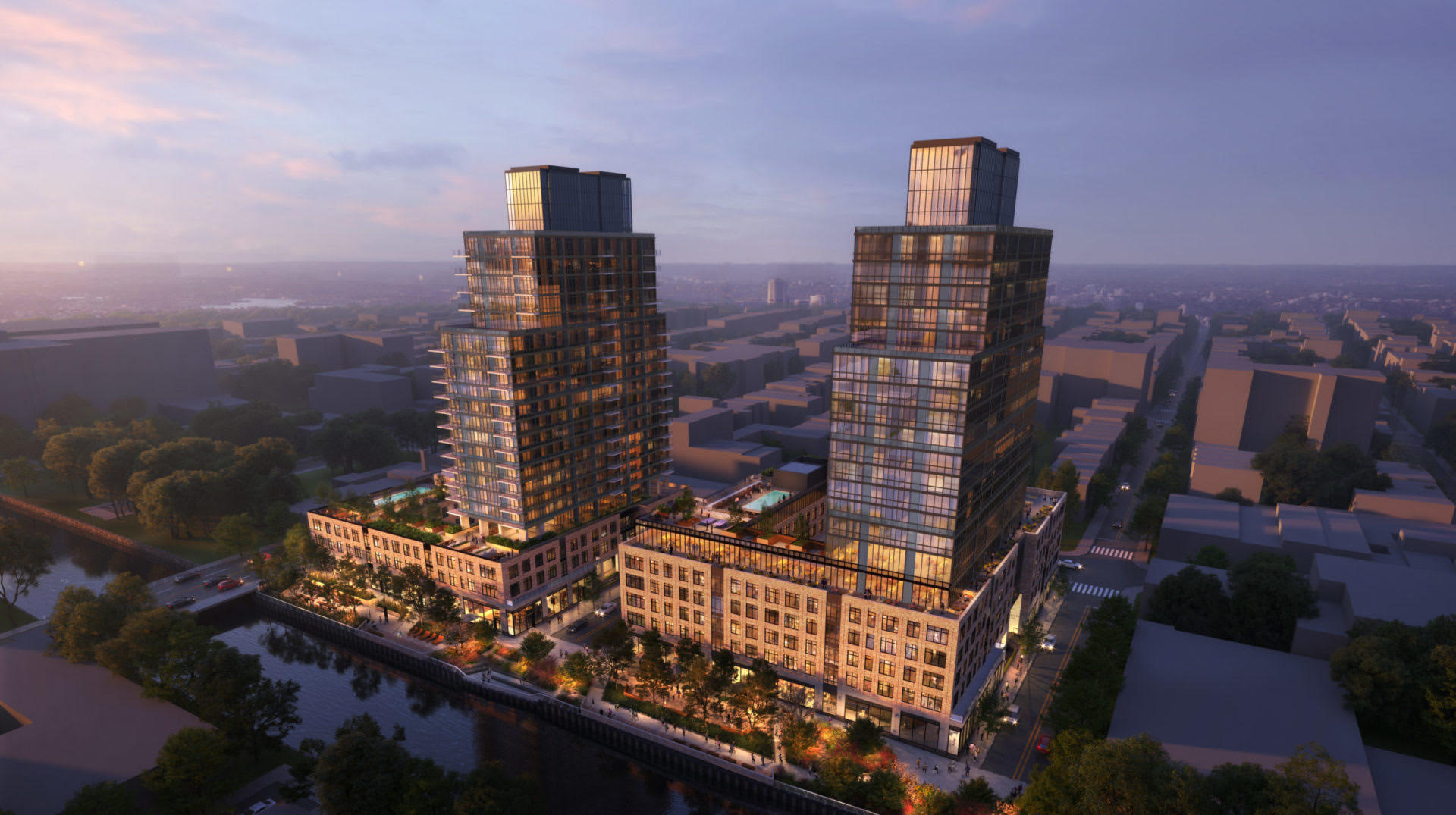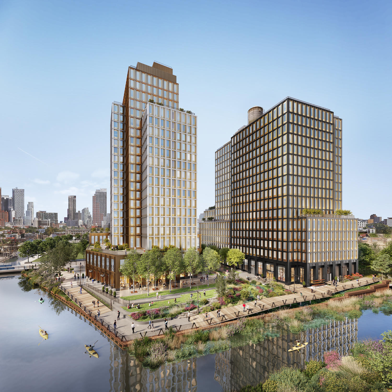 Both towers will rise from brick-clad podiums topped with landscaped amenity decks, and feature dark glass curtain walls across all four sides. There will also be identical glass-clad mechanical bulkheads at the top of each building. A public waterfront esplanade spanning nearly 20,000 square feet will feature raised garden beds, wooden tables and seating, and plentiful landscaping lining the eastern side along the Gowanus Canal.