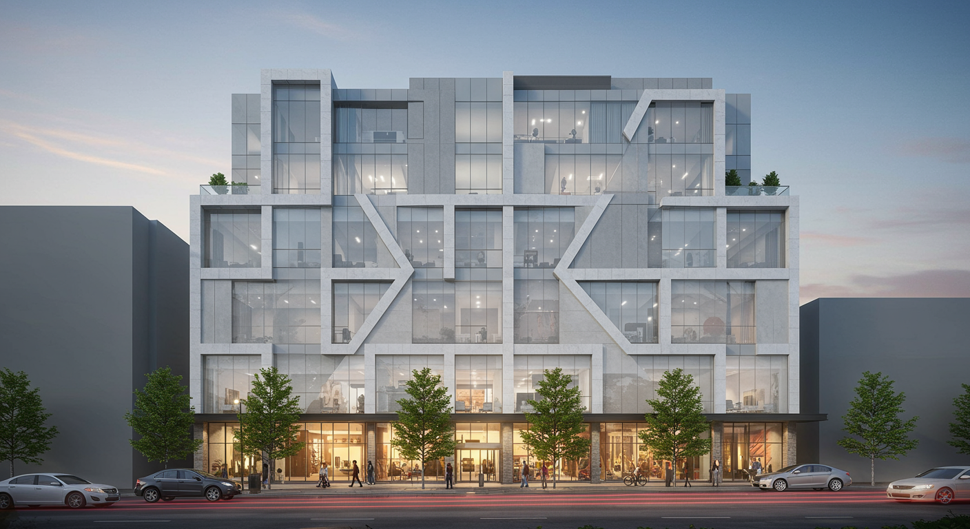 The main rendering of 585 Union Street shows a wavy pleated wall structure and a façade composed of light-hued stone framing floor-to-ceiling windows. A setback above the seventh story makes way for terrace space, followed by a more conventional massing clad in dark metal paneling up to the flat parapet. The ground-floor frontage will feature larger windows topped with canopies matching the undulating shape of the building above.
