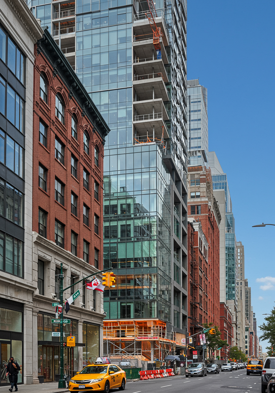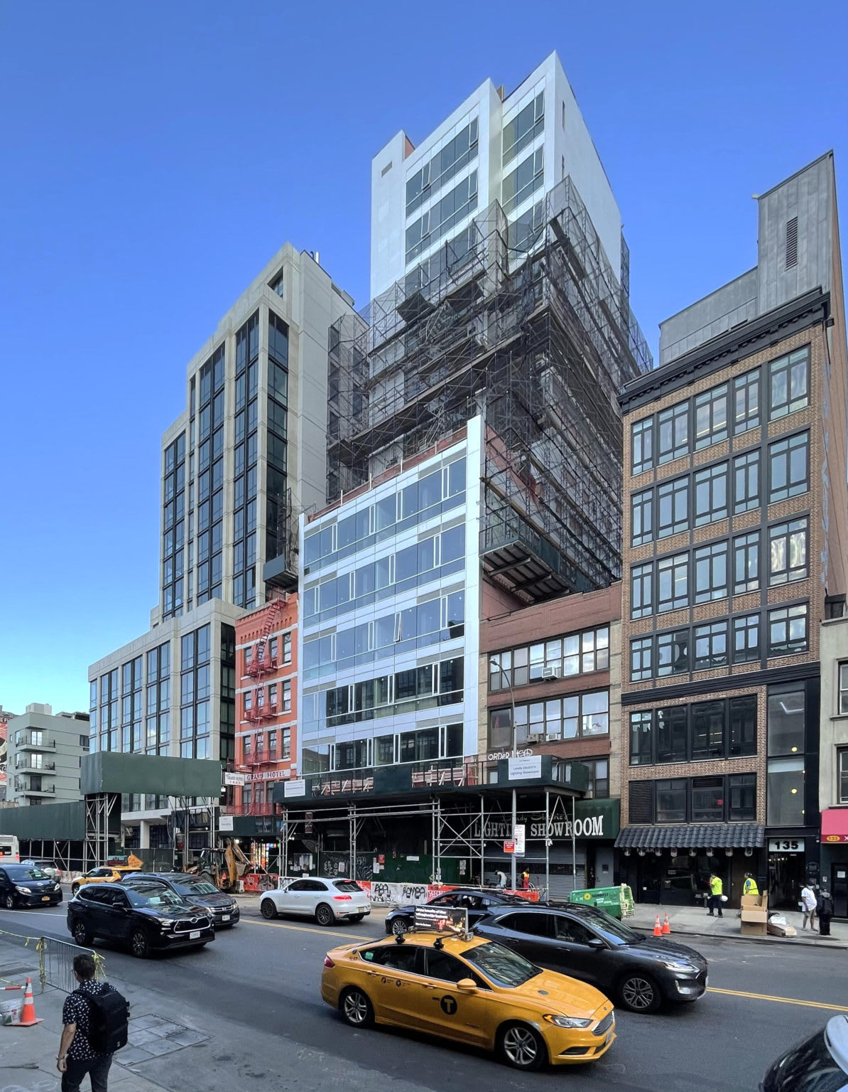 Our final site that will continue to add to the growing number of new apartments in New York City is 139 Bowery, a topped out 14-story mixed-use residential building designed by Raymond Chan Architects and developed by Global Joint Venture which will bring 16 residential units as well as ground-floor retail space, a 550-square-foot medical facility, and office space on floors two through five. The nearly finished project is located on a relatively narrow plot between Broome and Grand Streets in the Bowery section of the Lower East Side.