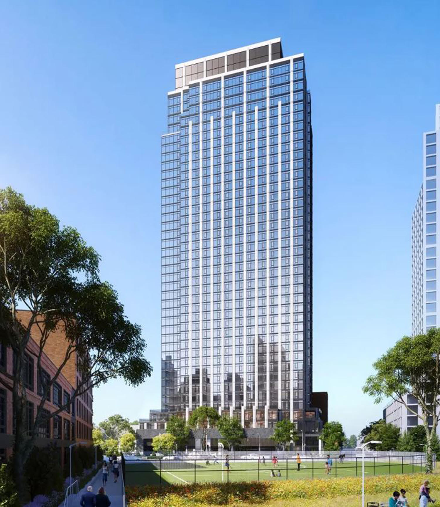 Located on the western edge of Greenpoint, Brooklyn is 16 Dupont Street, a rising 40-story, 400-foot tall skyscraper designed by GKV Architects and developed in a partnership between Rockefeller Group and Park Tower Group. The ground-up 365,651-square foot development will yield a total of 378 rental units, 2,458 square feet of commercial space, and 138 enclosed parking spots, and is part of the larger Greenpoint Landing master plan that aims to transform the waterfront by bringing thousands of new residential units. The project is situated at the intersection of Dupont, West, and Commercial Streets and is expected to be finished in the spring of 2025.