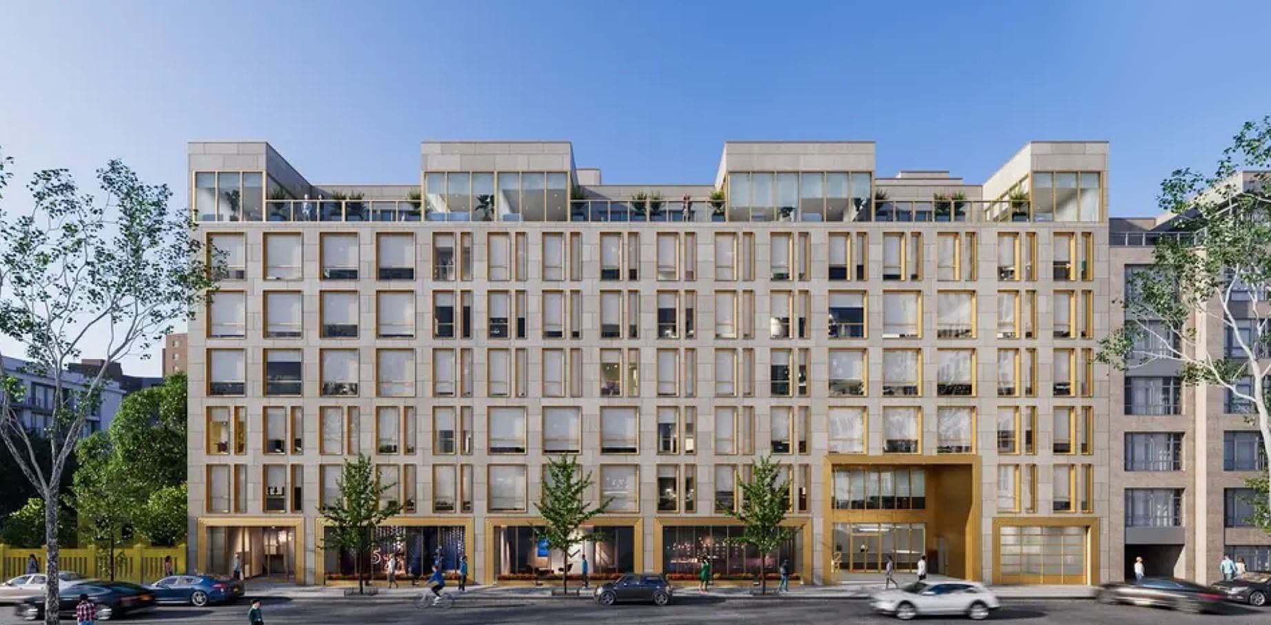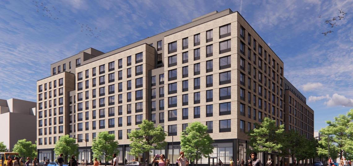 There will be 94 studios, 105 one-bedrooms, 150 two-bedrooms, and 26 three-bedroom units. Apartments are reserved for residents with an income of 40 to 90 percent of the area median income, with 57 dedicated to the formerly homeless. Future residential amenities include a landscaped roof deck, a fitness room, a children’s play space, a party room, a tenant lounge, and 61 above-ground parking spaces for rent. Completion is scheduled for the summer of 2024.