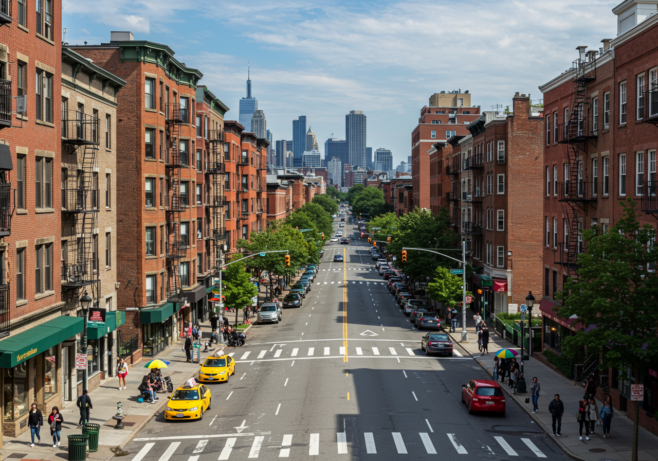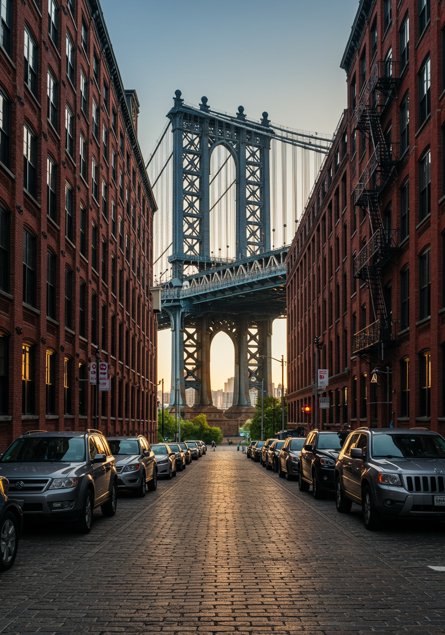 Washington Street is one of many streets located within the Brooklyn waterfront neighborhood of DUMBO. Once a concentrated setting for factories, warehouses and an active shipping port, the district underwent a massive transformation in the past decade into becoming one of the most desirable neighborhoods for luxury residences, office headquarters like Etsy, fine dining, and retail shopping. Part of the area's revival brought with a surge of curious tourists looking for a new place to discover outside of Manhattan. Washington Street, although only spanning a few blocks, is one of these unique spots due to its perfectly centered alignment with the southern tower of the Manhattan Bridge. This is further accentuated with the Empire State Building seen further in the background, making it one of the best sightseeing spots.