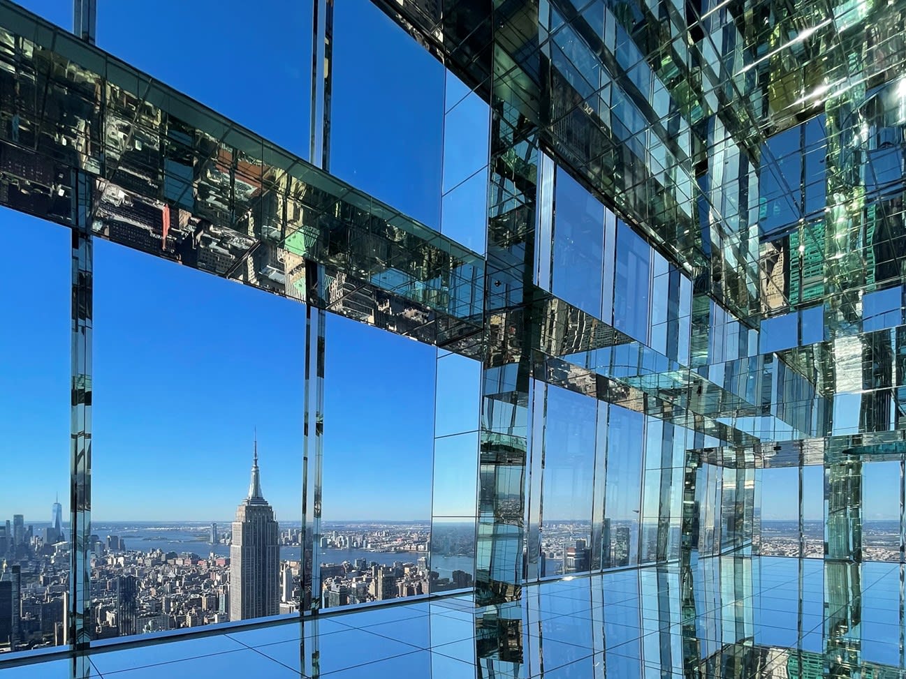This is New York City's newest observatory, having celebrated its one-year opening on October 21. The three-story indoor-outdoor experience features a collection of immersive spaces and art installations from Kenzo Digital, called "Air." The first and biggest room at SUMMIT is the two-story mirrored atrium called Transcendence 1, providing a mesmerizing visual spectacle of seeing the grid and buildings of New York on every floor tile column and wall paneling. Other exciting aspects include two glass boxes hanging more than 1,000 feet over Madison Avenue, artwork by Japanese artist Yayoi Kusama, a balloon-filled room called "Affinity," a room with a massive LED screen called "Unity" giving one the experience of flying above the clouds, and finally a cafe called and an outdoor terrace on the third and final level. It is here one can also ride two elevators with glass floors that take one above the facade for a better view of New York in the daytime or nighttime.