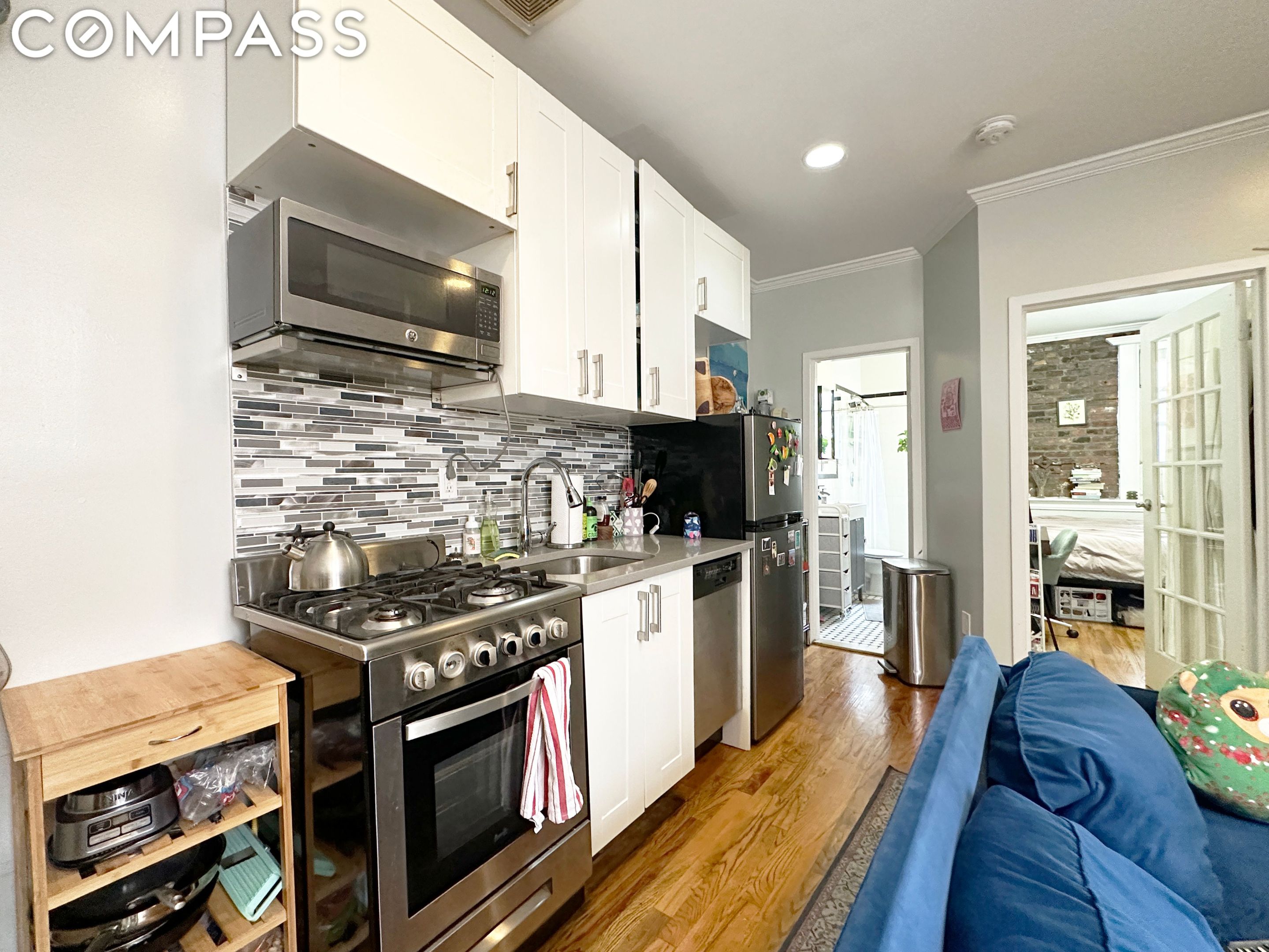 The unit features: open full kitchen, wood floors, high ceilings, hard wood floors, exposed brick and good light.