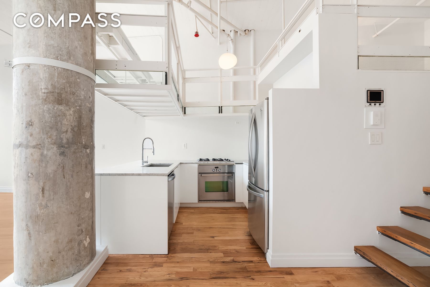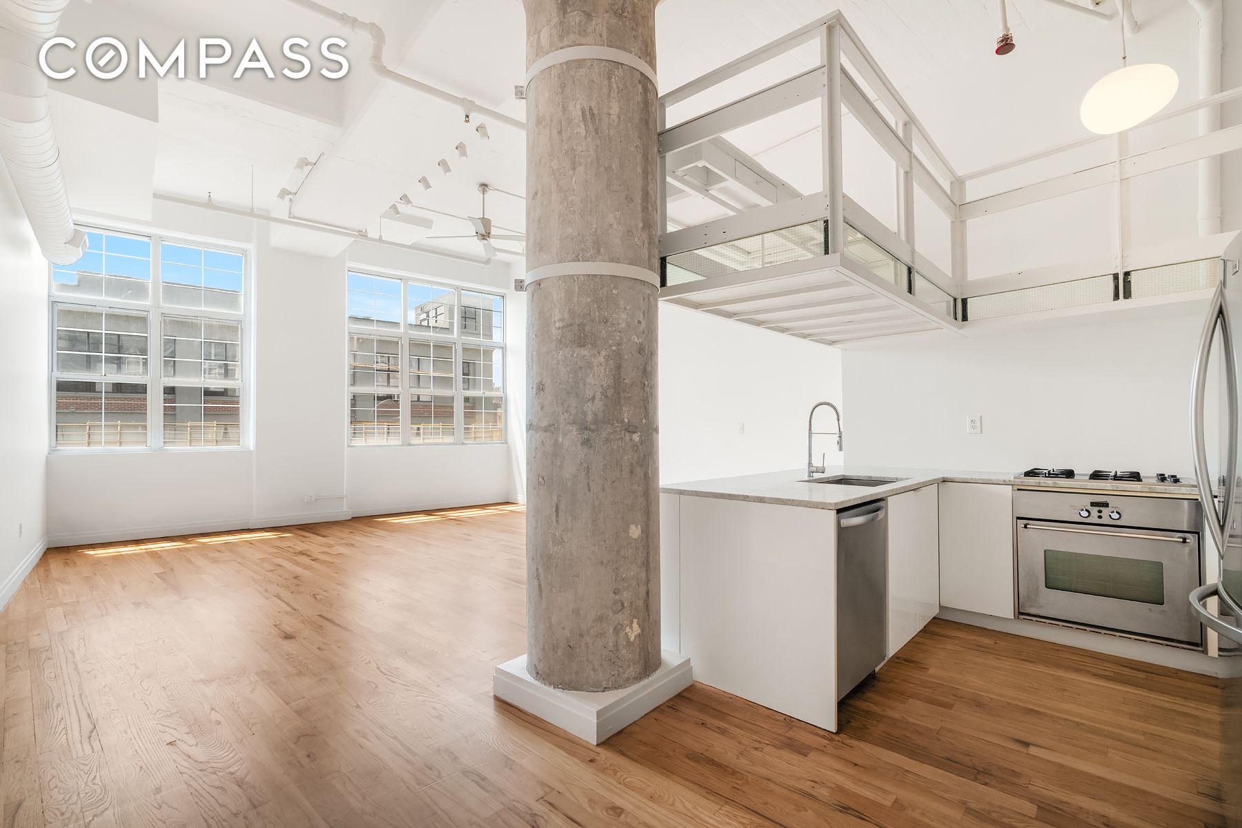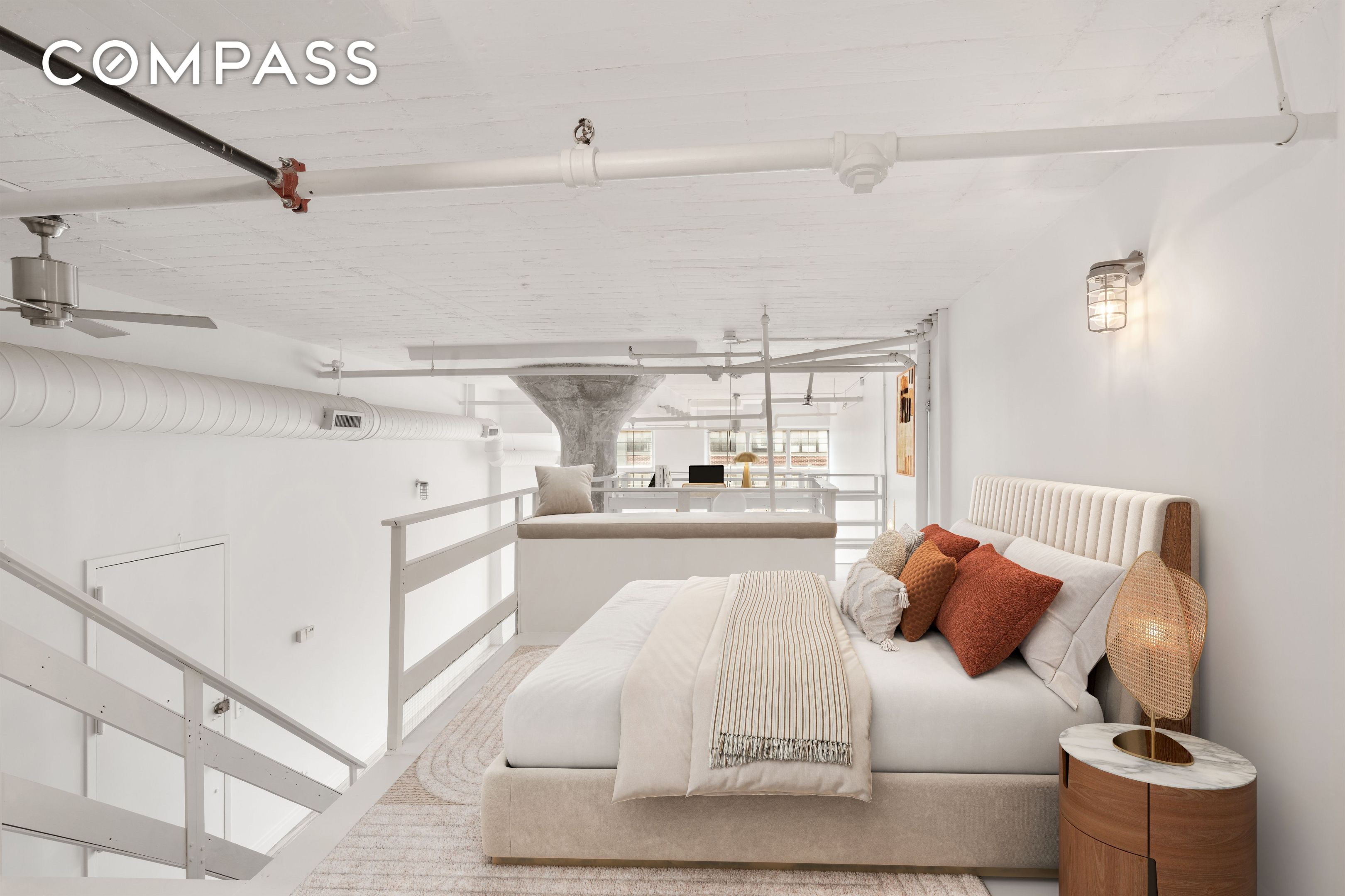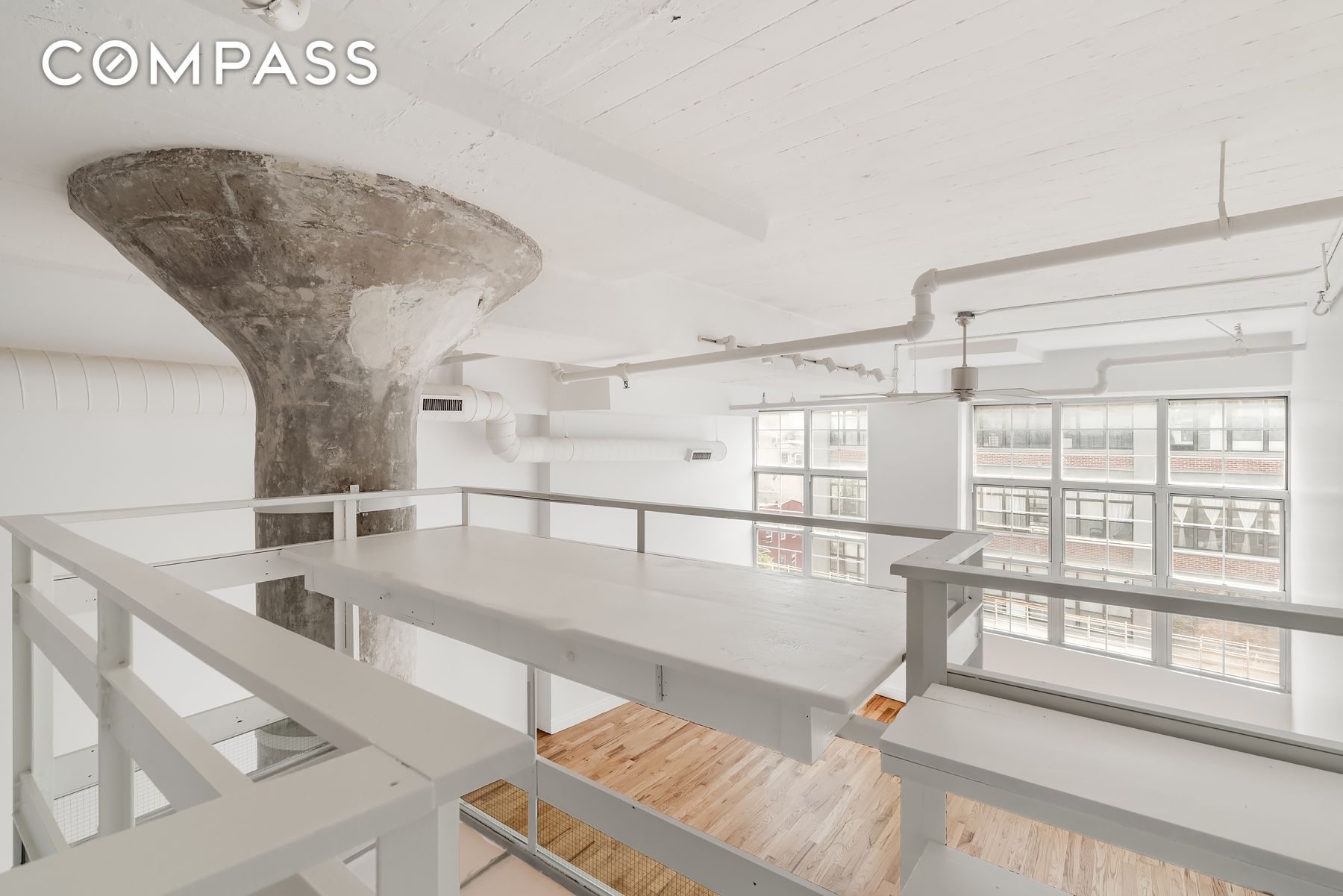 Live large in this character-filled duplex loft set in a former chocolate factory at the intersection of Williamsburg and Bedford-Stuyvesant. Soaring 13-foot high ceilings, exposed ductwork, and original concrete columns define the space, while oversized factory windows flood the home with natural light.